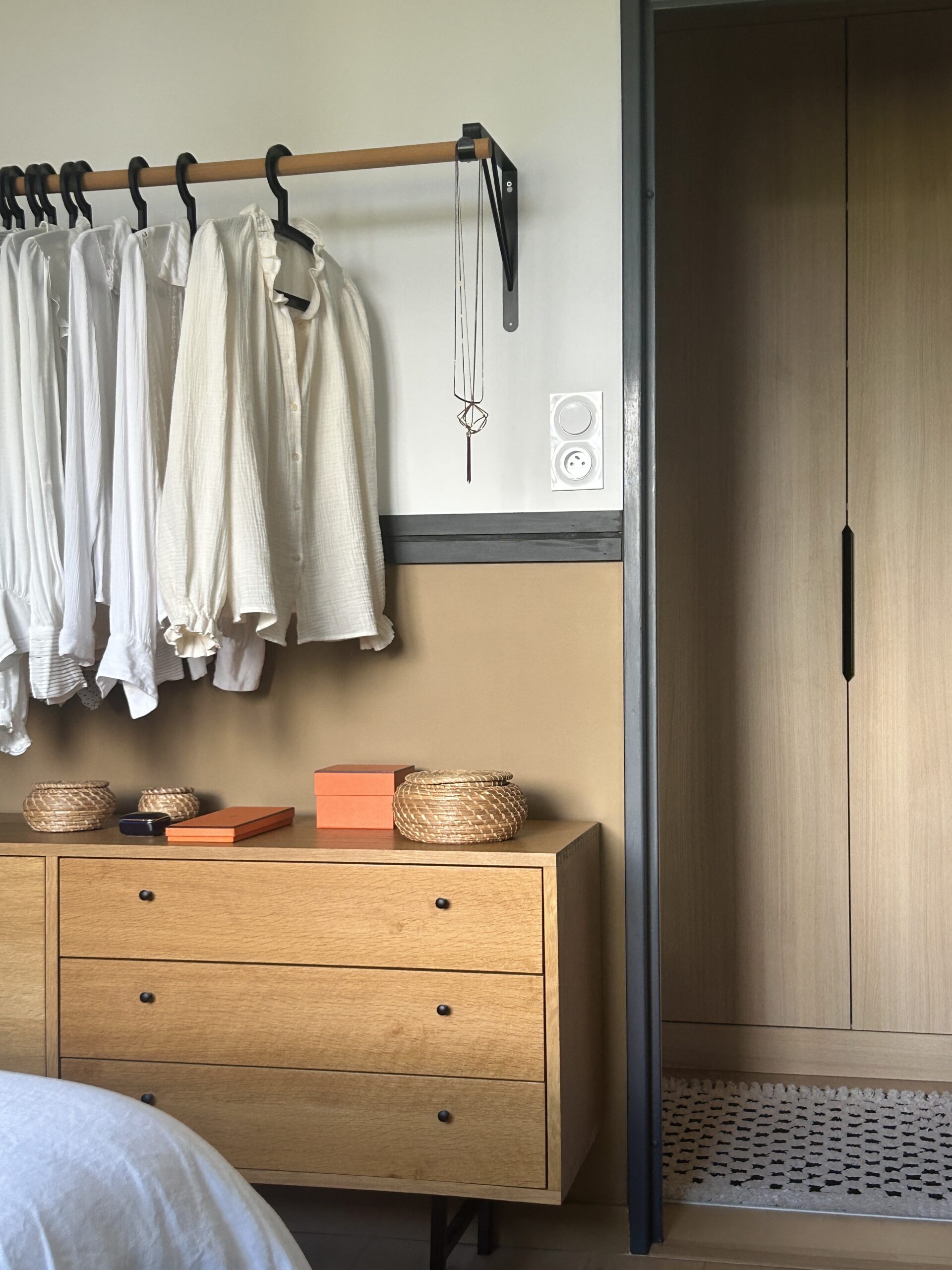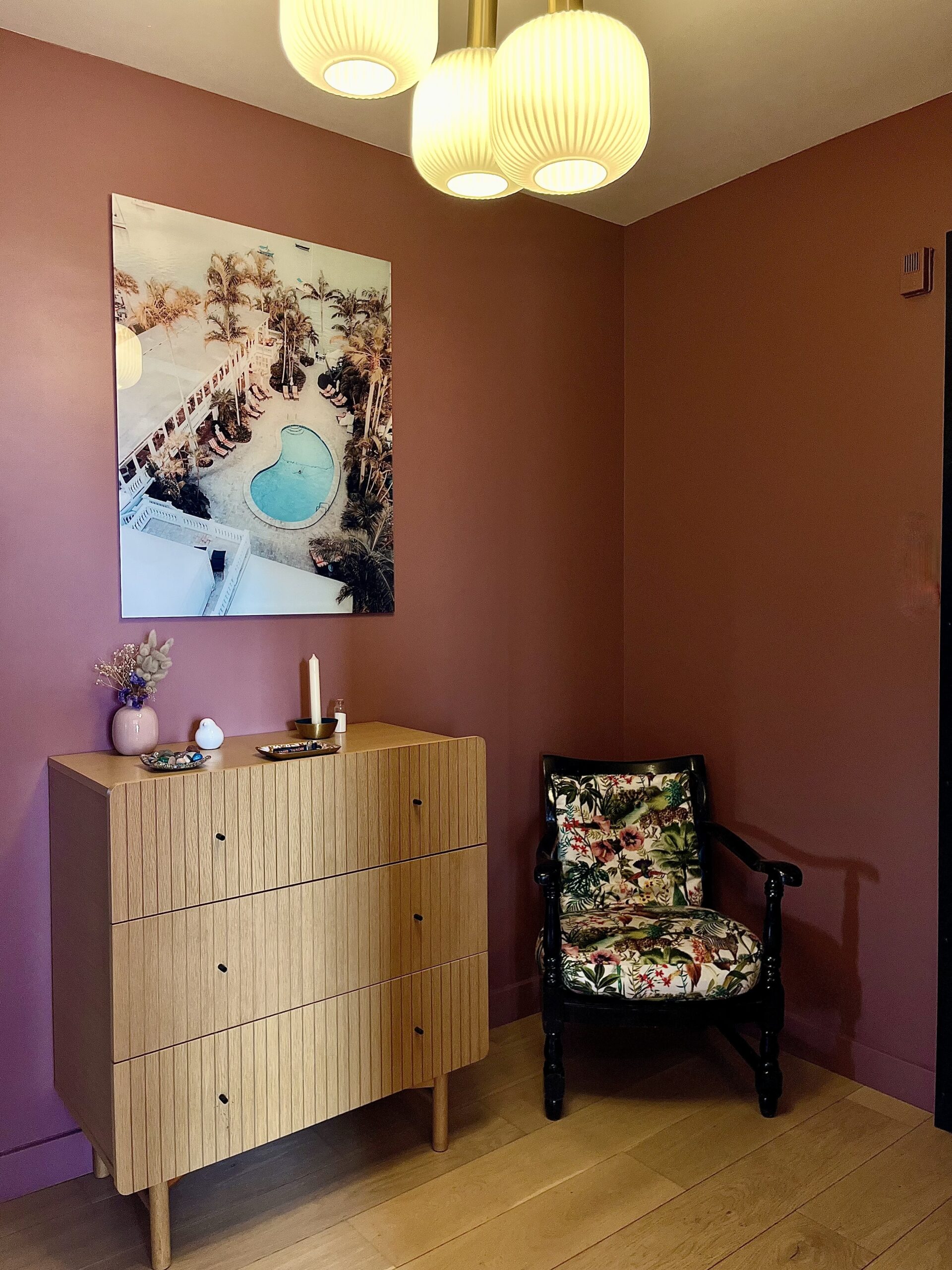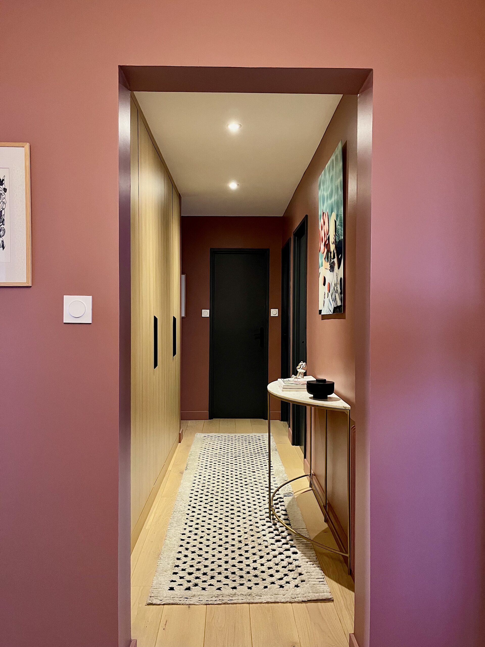 Dans l’entrée, le rose illumine l’ensemble et se marie parfaitement avec le bois clair du sol et les portes des placards du couloir.