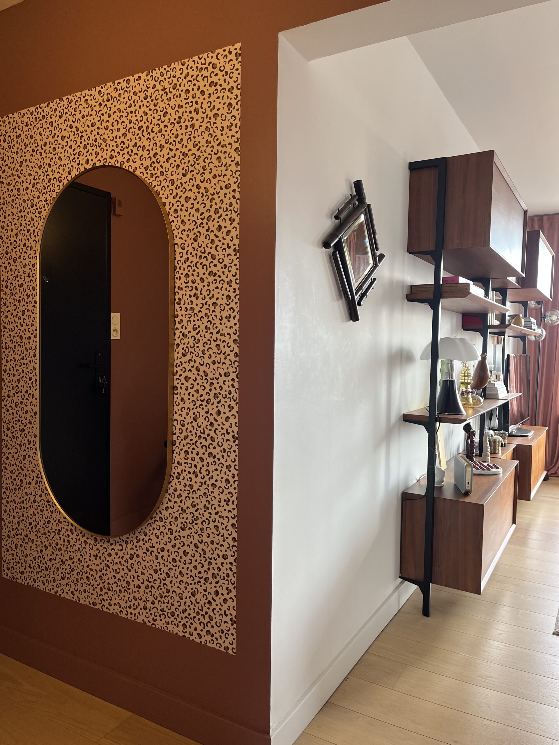 Sur le coté gauche, un papier peint leopard soulige le grand miroir doré.