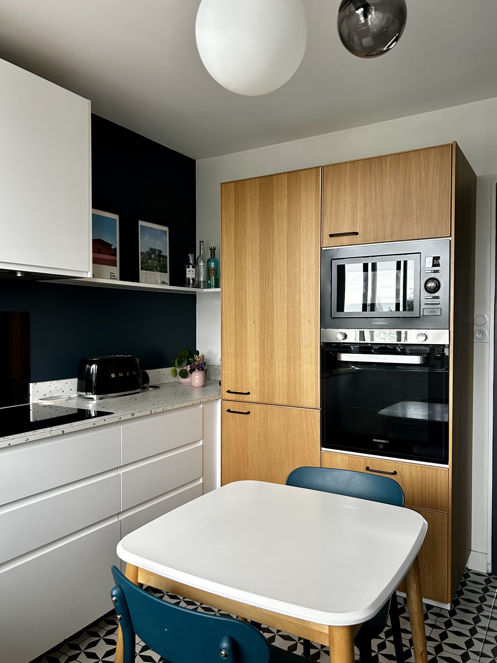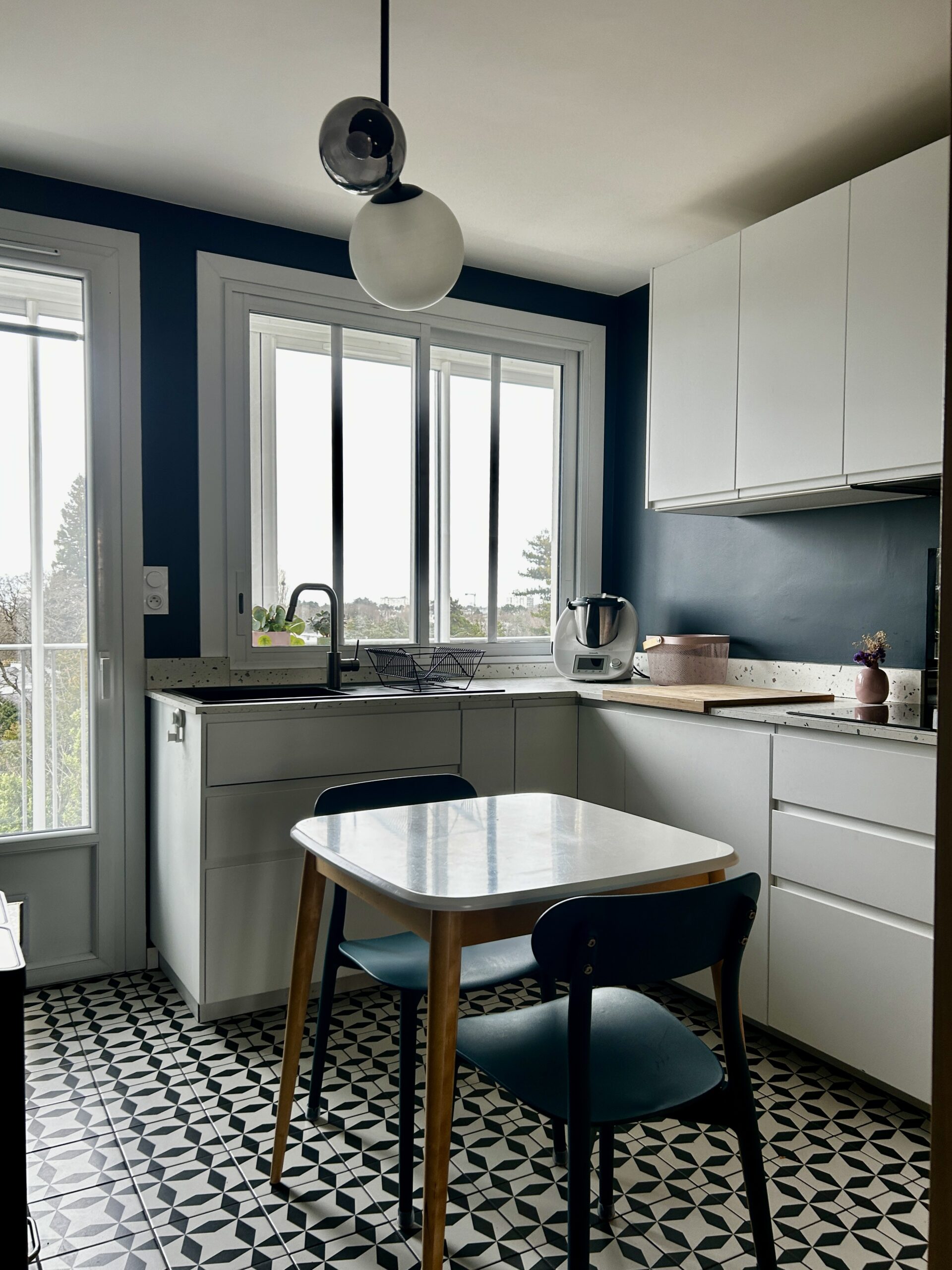 Dans la cuisine, c’est un bleu encre qui donne le ton. L’agencement a été travaillé de façon à integrer un maximum de rangements.