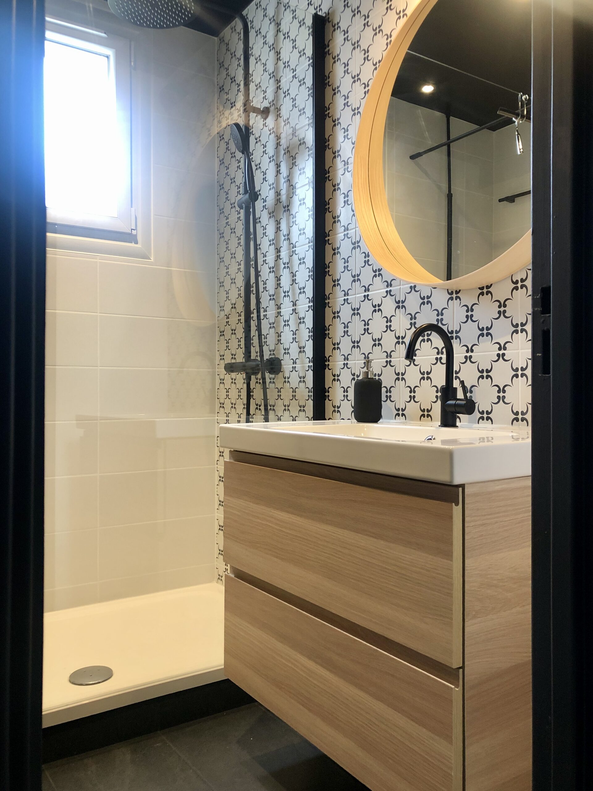 La salle de bain en noir et blanc reste intemporelle. Le meuble en bois rechauffe l’ensemble.