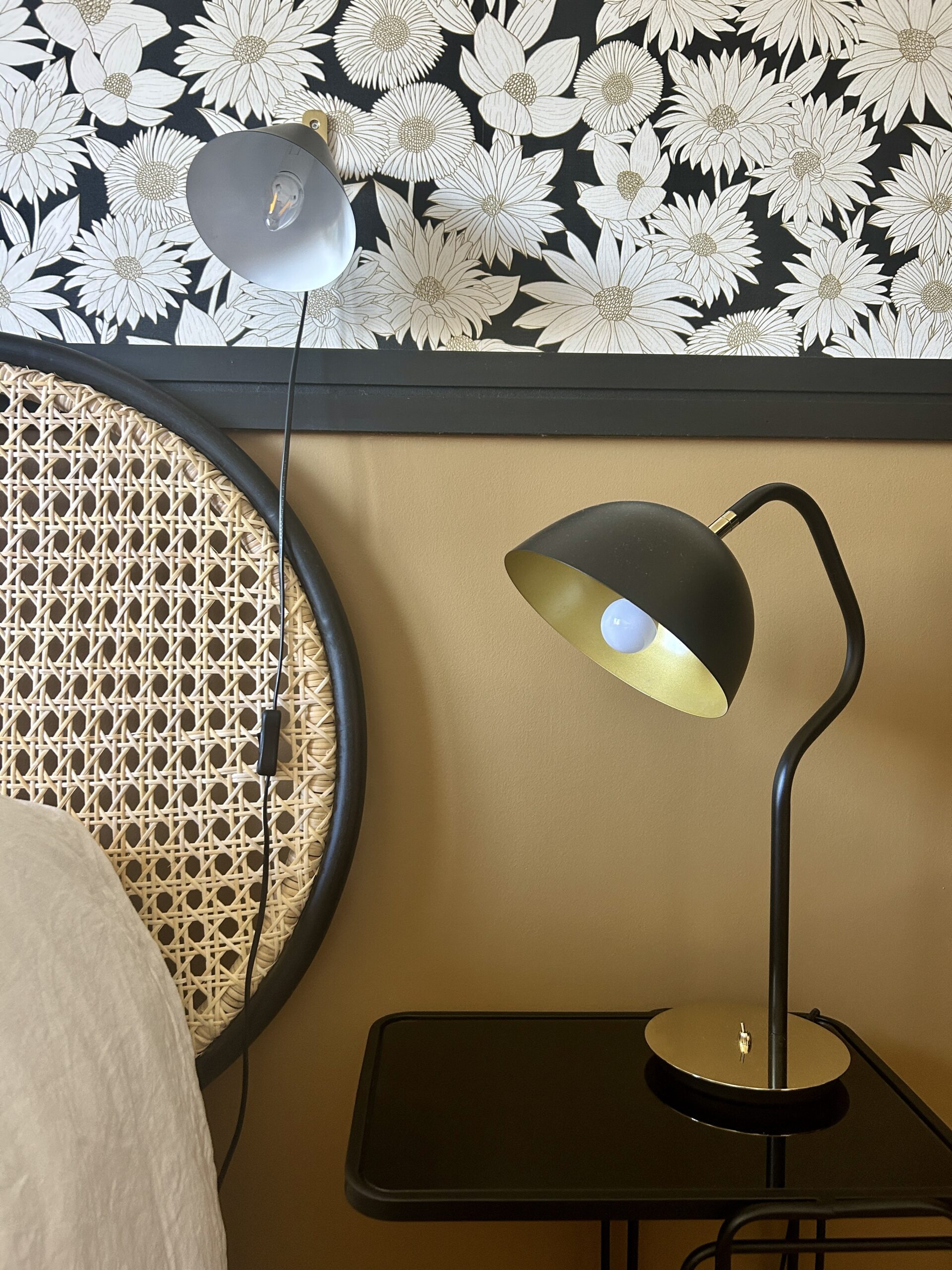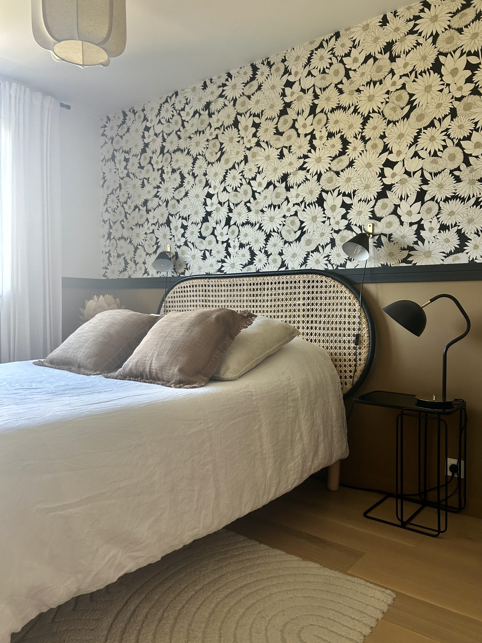 Coté chambre, un papier peint en partie haute apporte un coté exotique. Une cimaise noire souligne le teinte ocre brun des sous bassements.