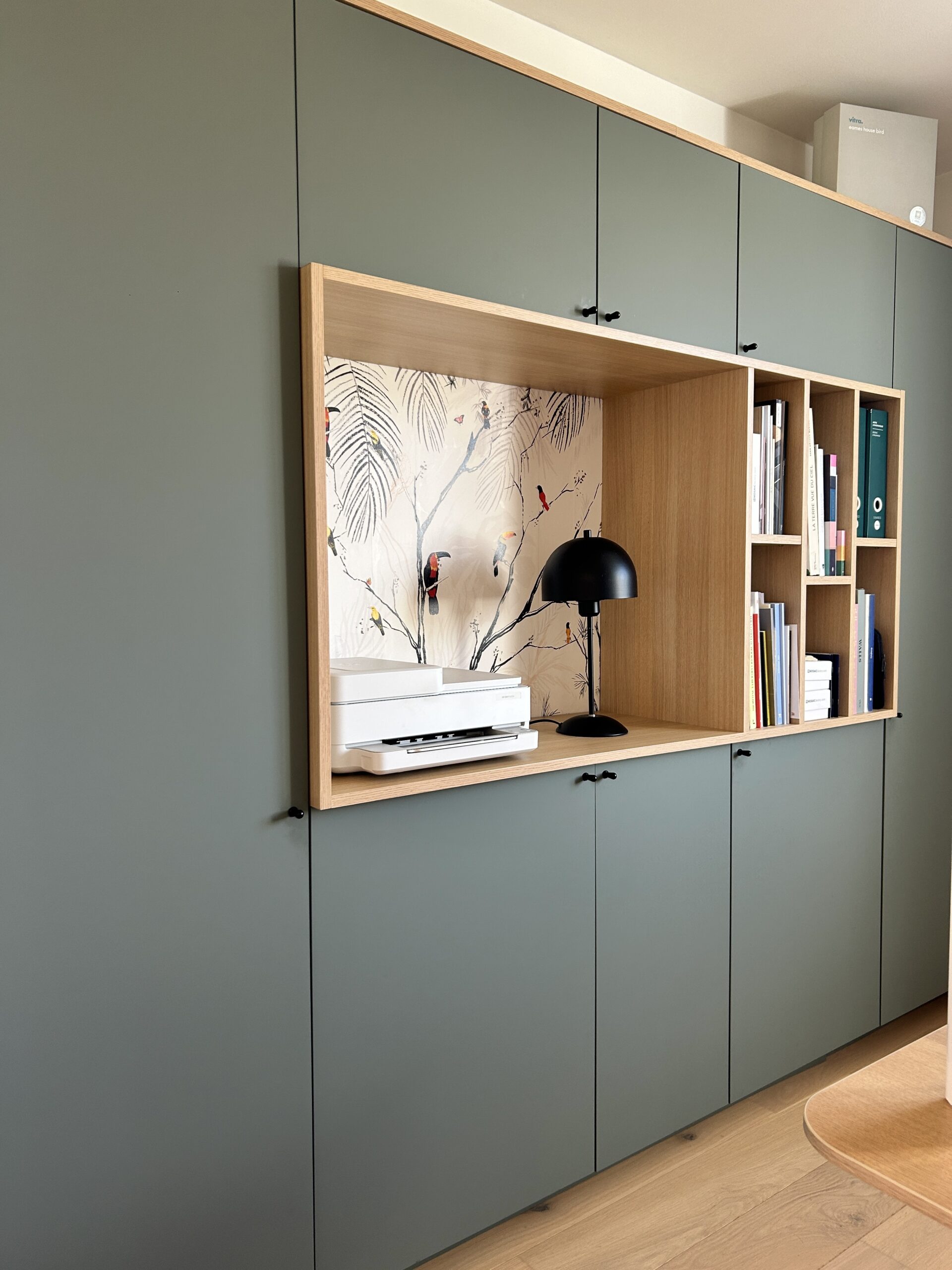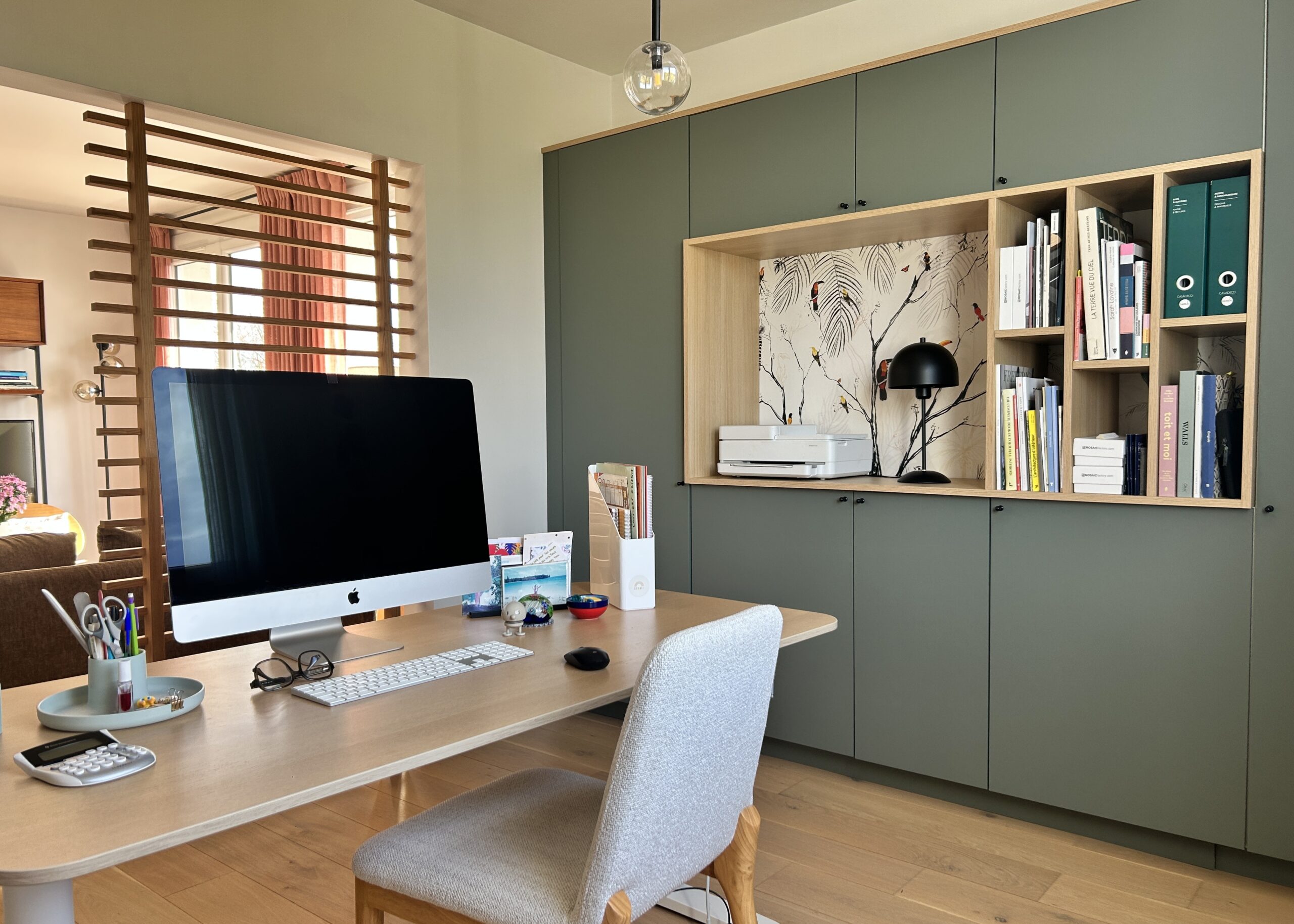Coté bureau, j’ai crée une grande composition avec des bases de meubles Ikea et une niche en relief sur mesure.